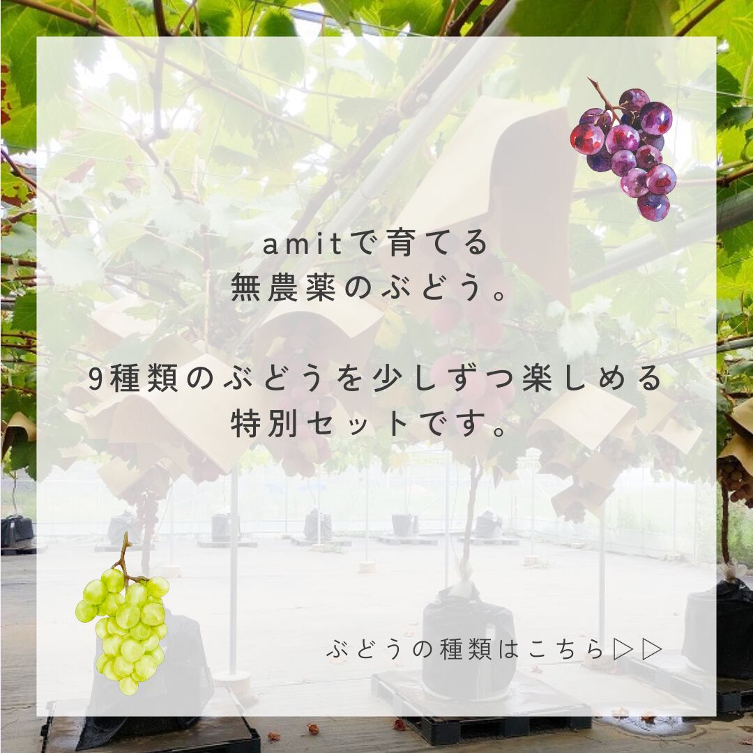 農薬・化学肥料不使用で栽培している、amitのぶどう。9種類のぶどうを、少しずつ楽しんでいただける特別セットです。ご注文時に1番美味しいぶどうをお届けします。